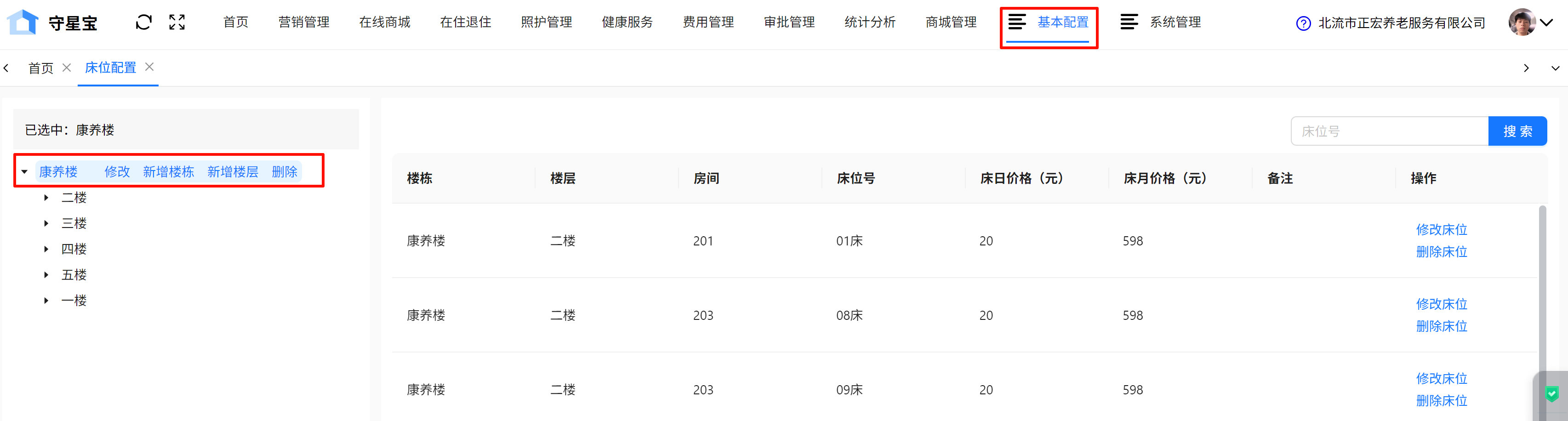 在基本配置-床位配置下,可以通过新增楼栋、新增楼层设置不同的楼栋,楼栋内的楼层。光标放到楼层的位置时,可以进行新增楼层、新增房间;光标放到房间上时,可以进行新增加房间和新增床位。