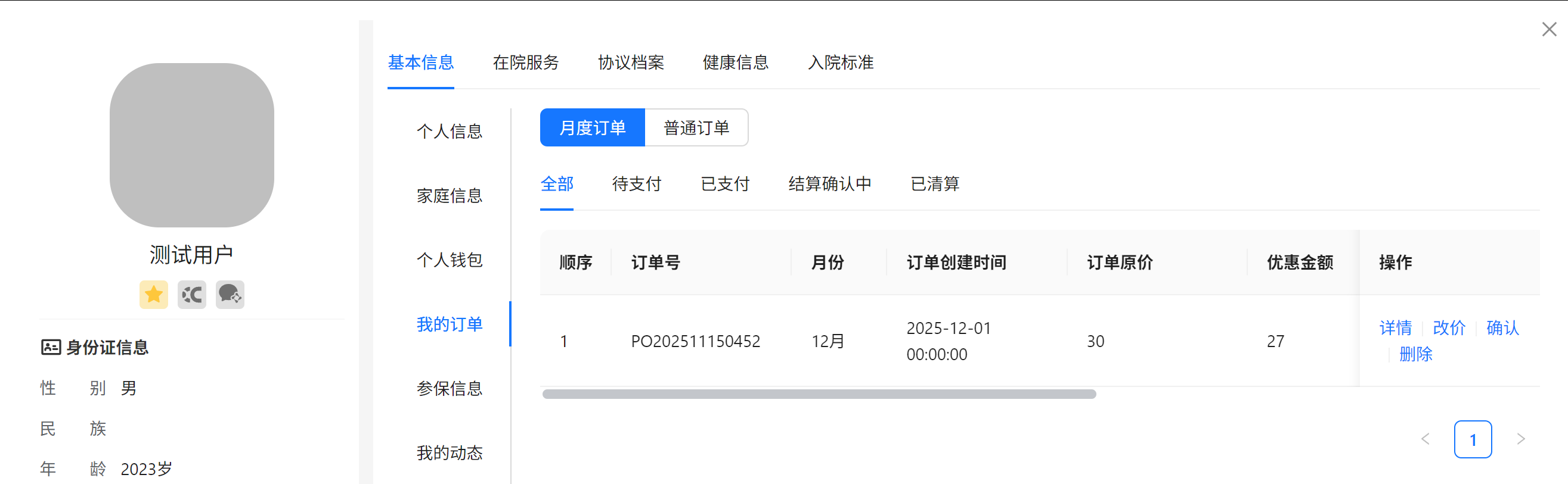 月度订单:即是在在线商城开单时勾选了月度账单项之后,会将该账单生成一个费用模板,每个月会按这个费用模板进行月度费用的订单生成,具体操作可以查看长者入住办理-在线商城部分。通过上图我们可了解到订单数据内有订单月份、相关的金额数据、订单的状态(分为待支付、已支付、结算确认中、清缴尾款)。