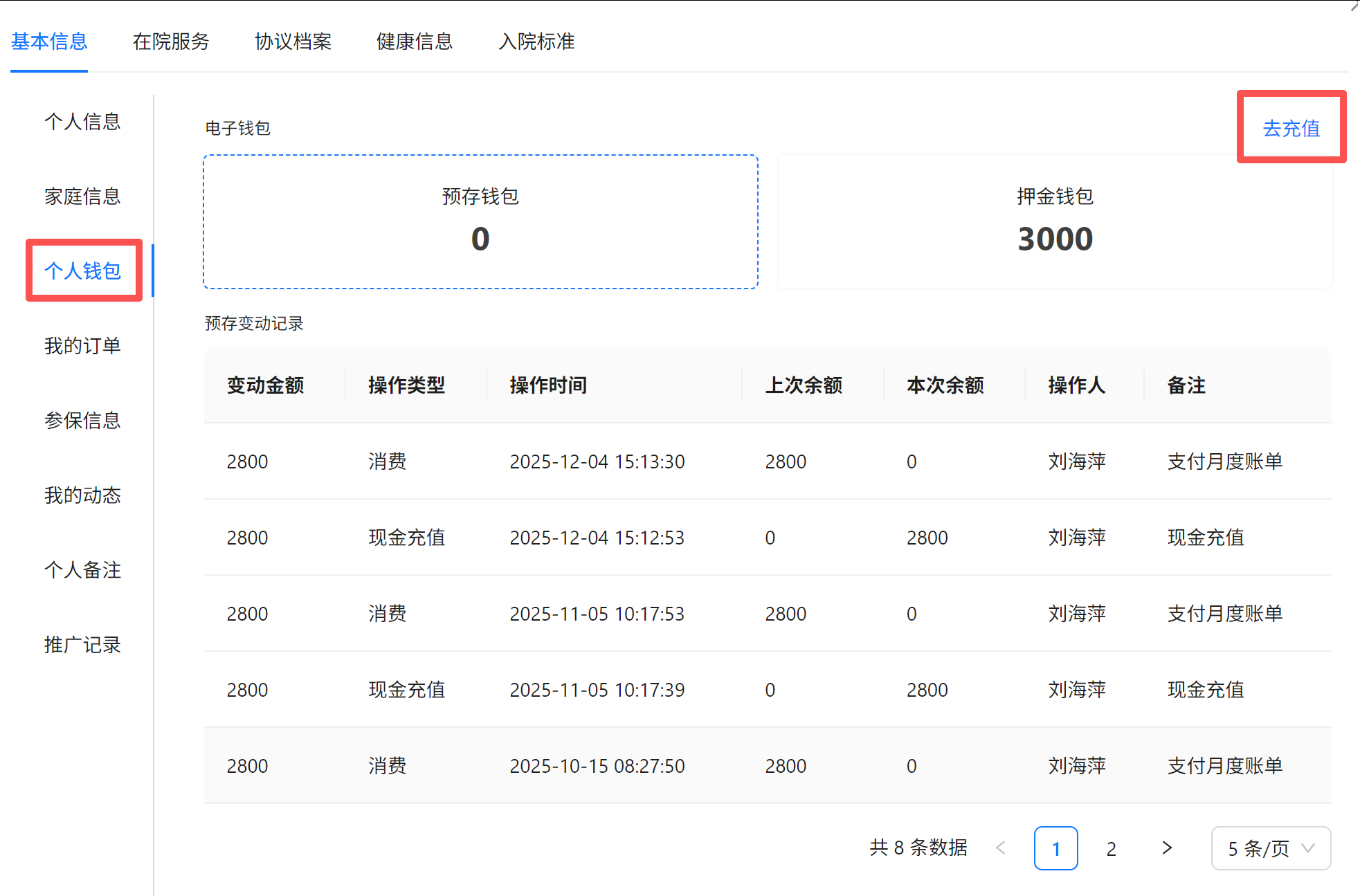 押金钱包:押金钱包是指长者入住时须缴纳的押金金额,押金金额不作任务订单费用的扣除,只会在特殊情况下进行人工操作扣除或出院时的费用抵扣。
