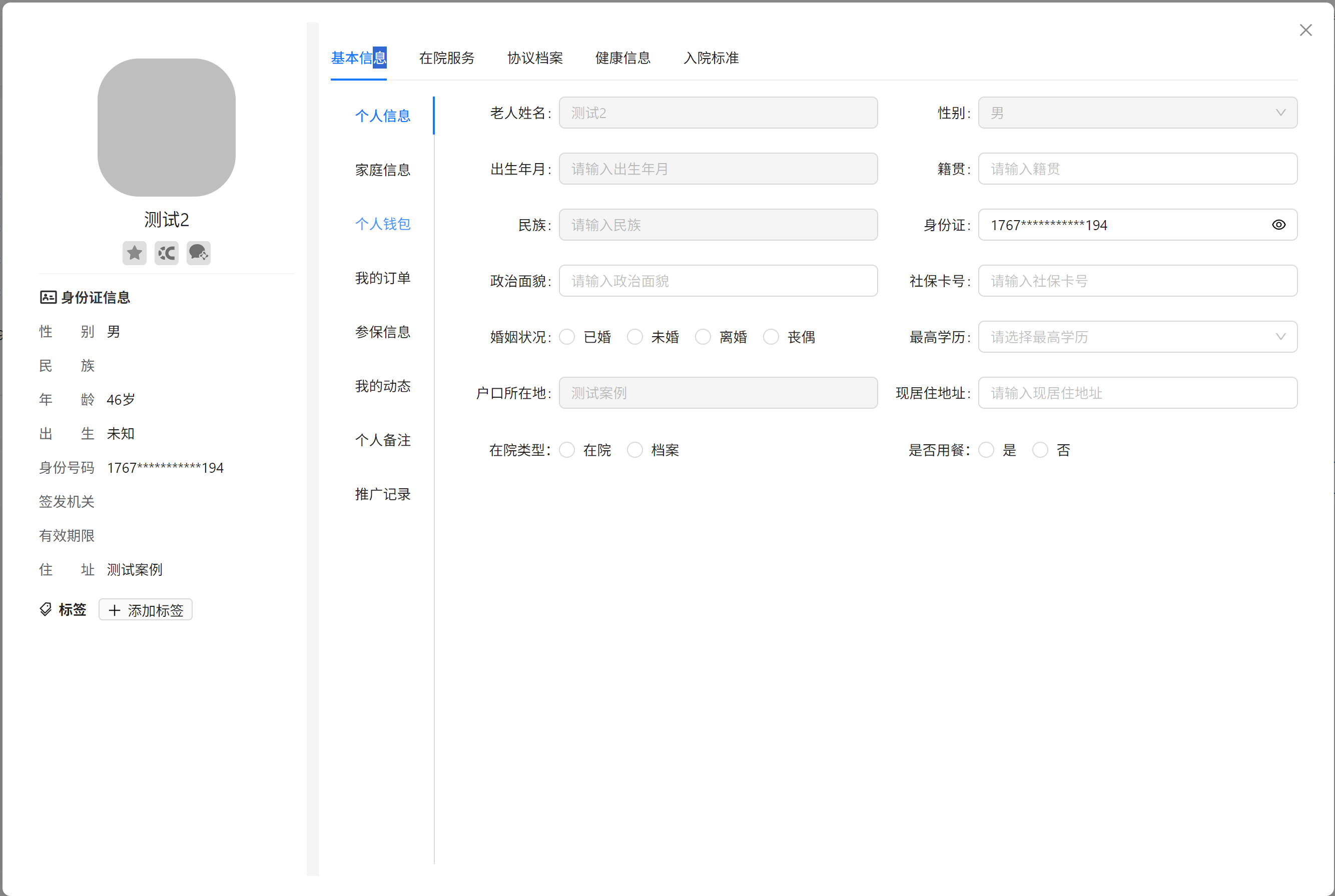 如上图为个人档案信息,在全员档案跟在住档案(在住长者)均可以查看个人档案信息。在个人档案信息页面左侧为该人员的身份信息、头像,右侧包括有基本信息、在院服务、协议档案、健康信息、入院标准等。