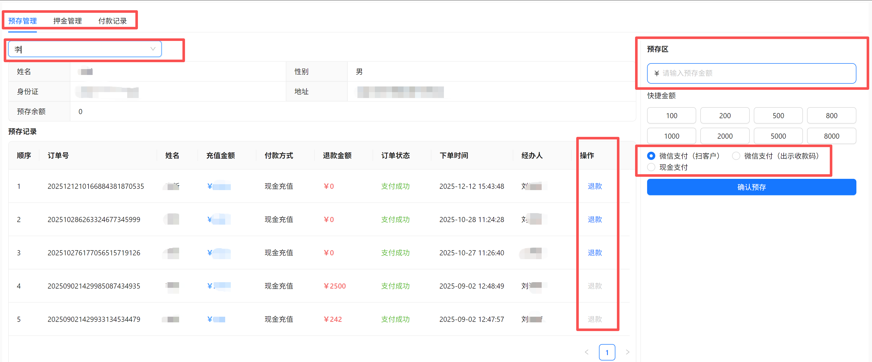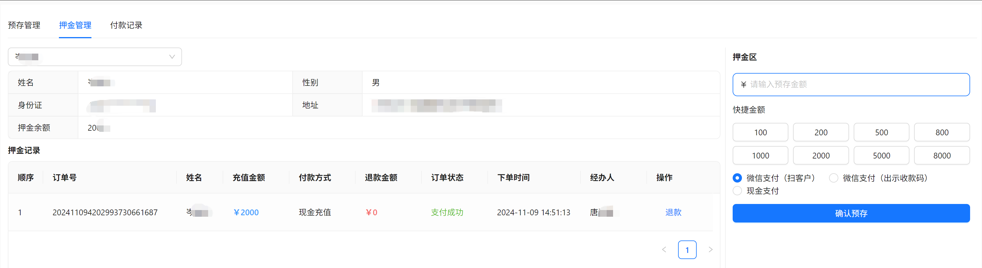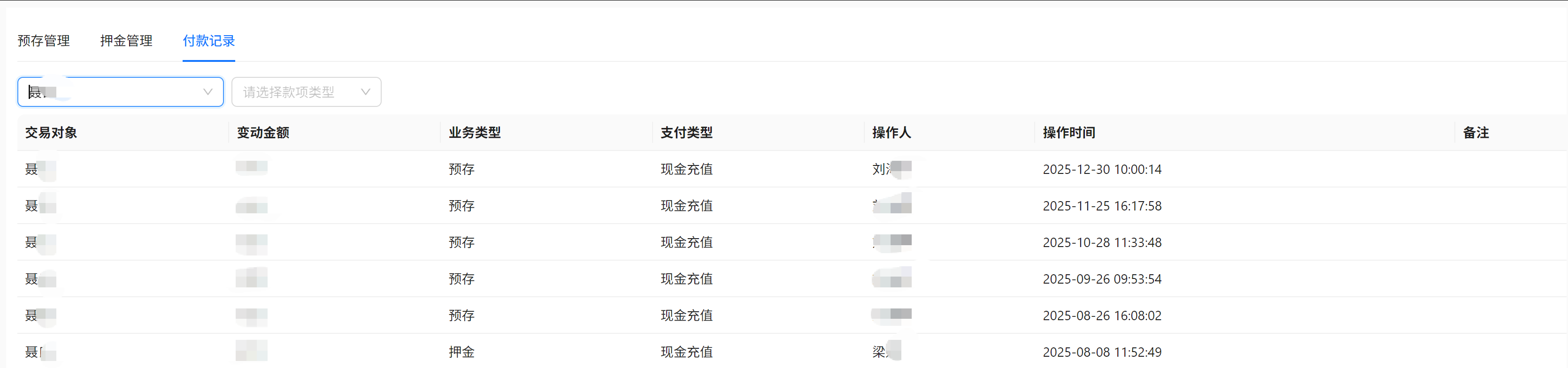 在该功能下主要包括预存管理、押金管理、付款记录功能项。
