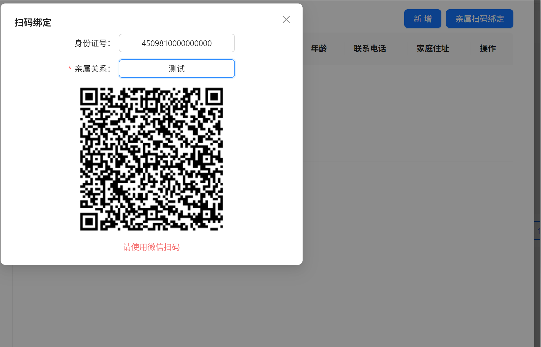 亲属扫码绑定:使用该种方式时,家属需要进行相关的系统注册(包括实名认证注册、非实名认证注册可查看人员注册信息录入),注册完成还需要进行亲属扫码绑定,点击亲属扫码绑定,在弹窗内输入该亲属的身份证号、亲属关系之后会显示一个二维码,亲属使用微信扫描二维码后即可完成家属绑定。