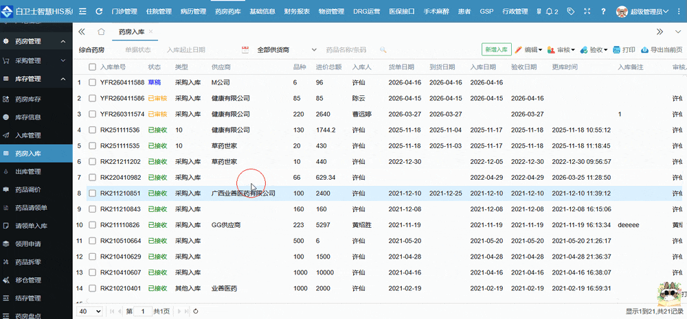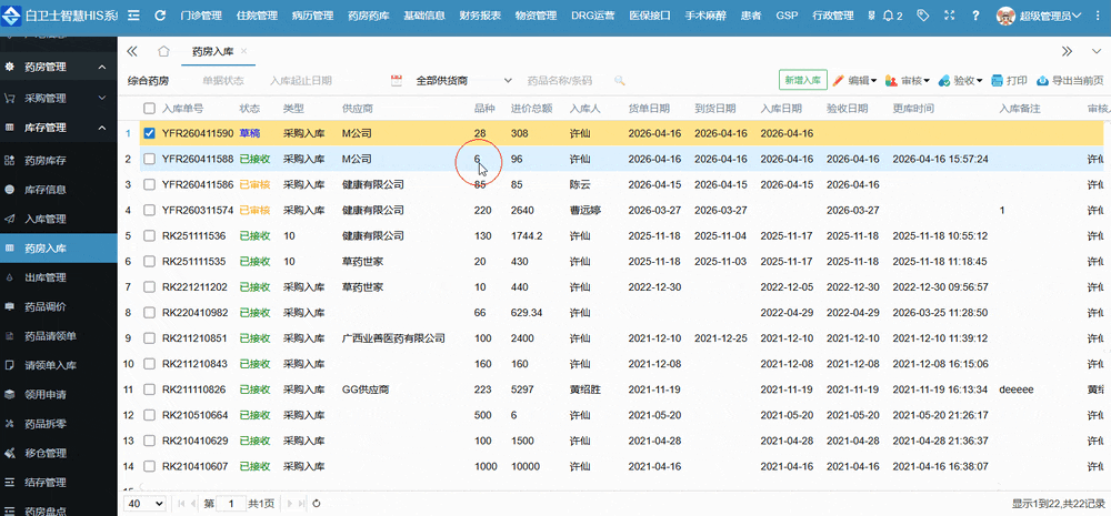 从药房入库的一个主页面来看,它与药房库存的大多数据项、信息和功能项是大体相似的,毕竟入库数据和库存的数据肯定是有联系的嘛!