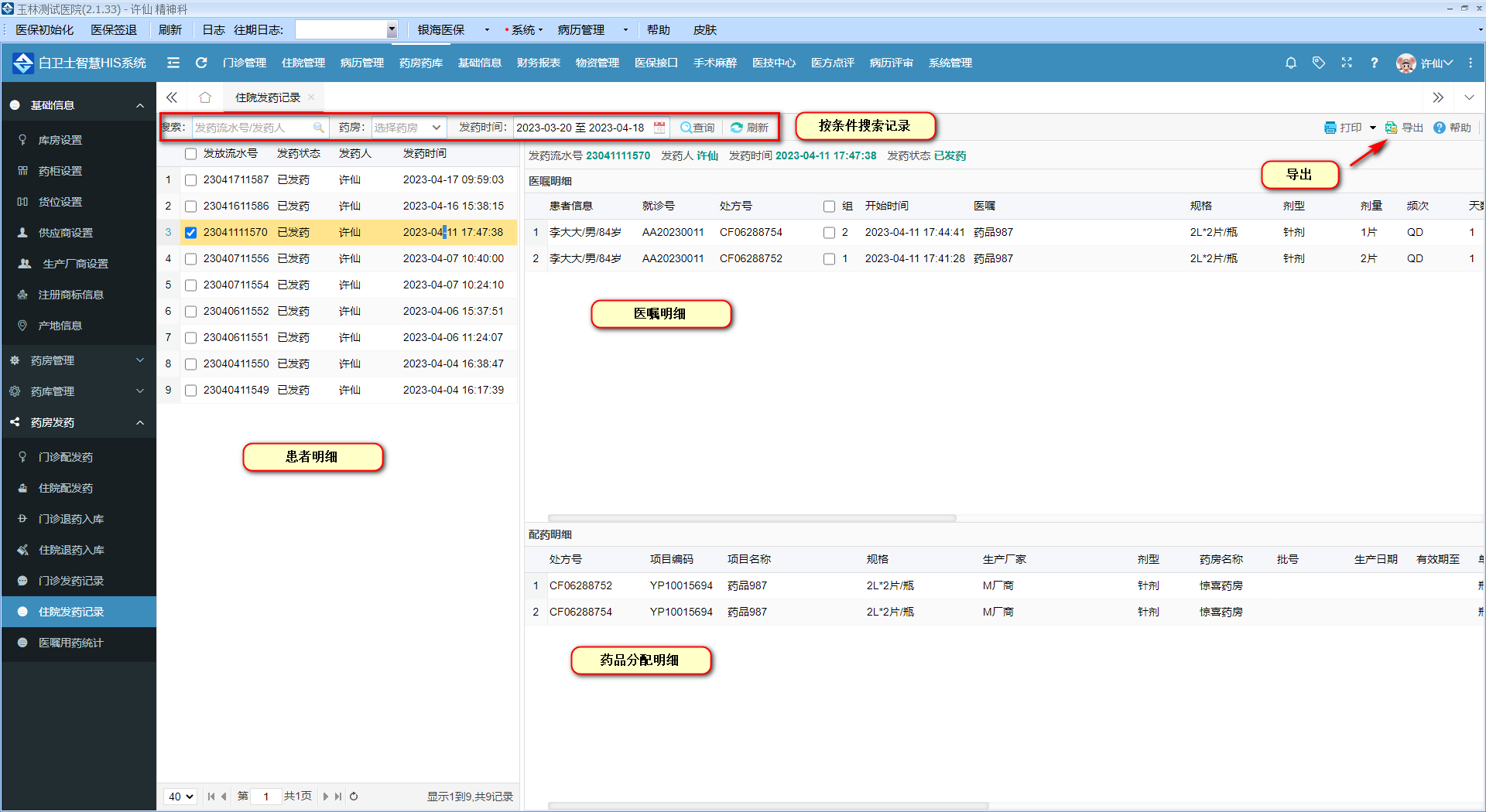目录 搜索 更新日志导医前台药房药库药房发药门诊发药住院发药门诊退药入库住院退药入库门诊发药记录住院发药记录医嘱用药统计药房管理采购管理库存管理报表查询药品GSP管理基础信息库房设置药柜设置货位设置供应商设置生产厂商设置注册商标信息产地信息门诊管理住院管理入院管理入院申请预约住院管理诊断信息维护在院管理在院患者管理住院病人登记簿住院欠费催缴出院管理出院申请出院结算出院结算查询出院信息编辑出院患者信息维护医生工作站医师医嘱管理医生医嘱(新)入院诊断编辑出院诊断编辑组套管理医嘱修改医疗术语维护医师医嘱签名维护校对工作站医嘱校对执行医嘱停嘱校对护士工作站床位安排中途转科医嘱发送失败处理住院执行单打印护士医嘱管理医嘱冲减医嘱冲减退药护士签名维护住院输液执行住院费用上传护理记录管理医嘱打印死亡人员登记住院执行清单住院历史查询住院费用清单当天医嘱执行清单住院药品发药单住院治疗项目清单医技管理病例评审运营管理财务报表医保管理手术麻醉医方点评系统管理 暂无相关搜索结果! 本文档使用 MinDoc 发布 住院发药记录 概述概述住院发药记录:此处可查看住院的发药情况。可通过流水号、发药人、选择药房、发药时间等查询住院发药情况文档更新时间: 2023-04-18 10:06 作者:刘国华