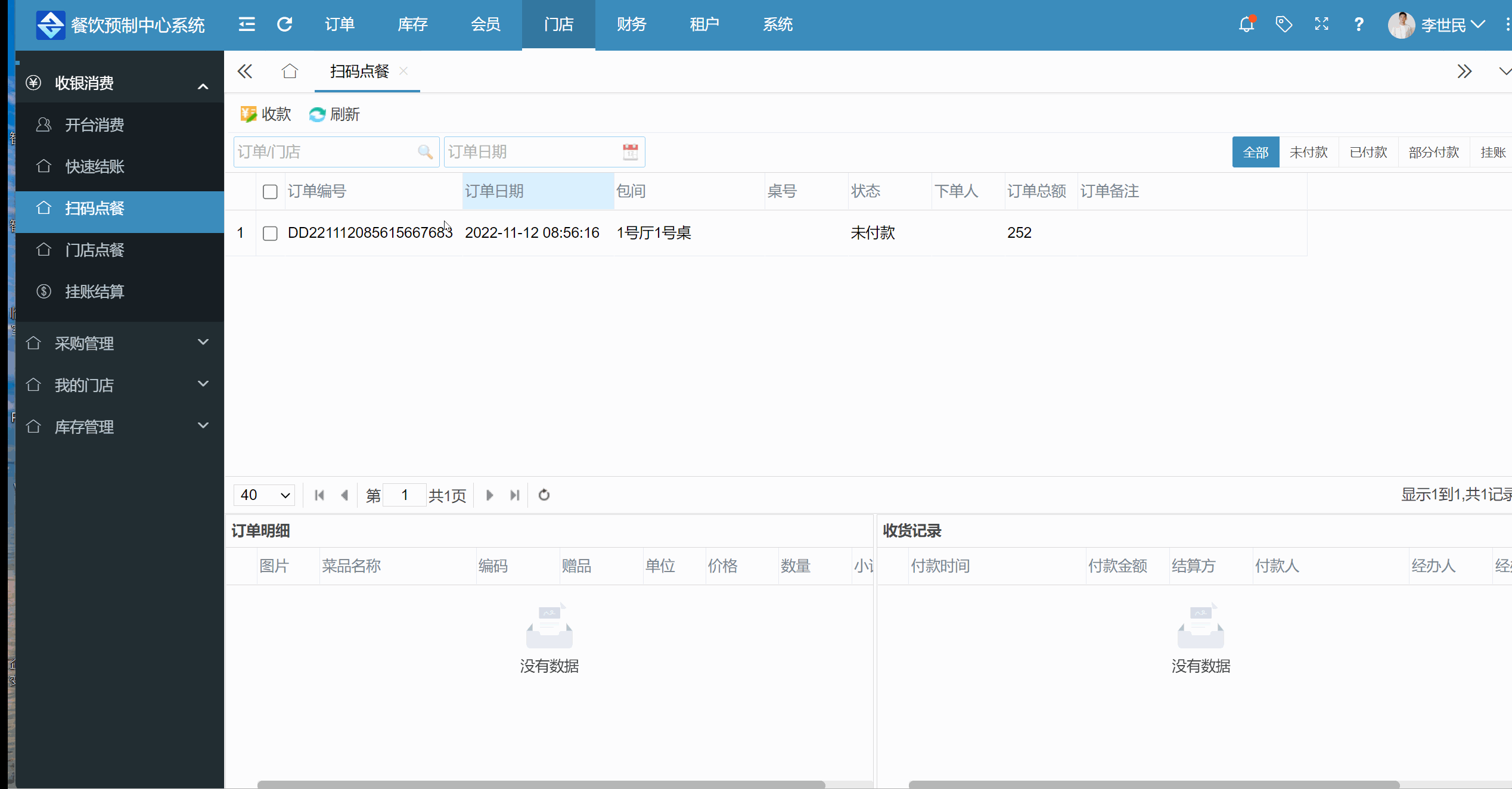 目录 搜索 引言1 系统1.1 基础信息1.1.1 企业信息1.1.2 门店管理1.1.3 员工管理1.2 权限管理1.2.1 角色管理1.2.2 登录账号1.2.3 功能菜单1.3 打印设置1.3.1 云打印平台1.3.2 打印机管理1.4 其他配置1.4.1 系统信息1.4.2 支付设置2 门店2.1 收银消费2.1.1 开台消费2.1.2 快速结账2.1.3 扫码点餐2.1.4 报单点餐2.1.5 挂账结算2.2 采购管理2.2.1 采购报单2.2.2 商城下单2.3 我的门店2.3.1 门店信息2.3.2 套餐管理2.3.3 包间管理2.3.4 包间预订2.4 库存管理2.4.1 菜品管理2.4.2 订单收货2.4.3 入库管理2.4.4 出库管理2.4.5 总部送货确认3 订单3.1 门店订单3.1.1 采购订单3.1.2 点餐订单3.2 配送管理3.2.1 车辆管理3.2.2 线路管理3.2.3 配送任务3.2.4 异常配送3.2.5 司机轨迹4 库存4.1 商品管理4.1.1 商品字典4.1.2 商品库存4.2 采购管理4.2.1 采购汇总4.2.2 采购计划4.3 入库管理4.3.1 采购入库4.3.2 商品入库4.4 出库管理4.4.1 分拣出库4.4.2 分拣包装4.4.3 加工出库4.4.4 商品出库4.5 供应商管理4.5.1 供应商信息4.5.2 供应商结算5 会员5.1 会员管理5.1.1 企业会员5.1.2 个人会员5.2 预订管理5.2.1 包间预订6 财务6.1 门店对账6.2 账期欠款6.3 供应商结算查询7 租户7.1 租户信息7.2 租户角色* 常用问题1 流程是怎样的?2 分拣完成后,下一步要做什么了? 暂无相关搜索结果! 本文档使用 MinDoc 发布 2.1.3 扫码点餐 概述只显示扫码点餐的订单,因为点餐时,客户已付款,这里不再需要收款操作。 操作步骤文档更新时间: 2022-11-29 15:19 作者:zhoug