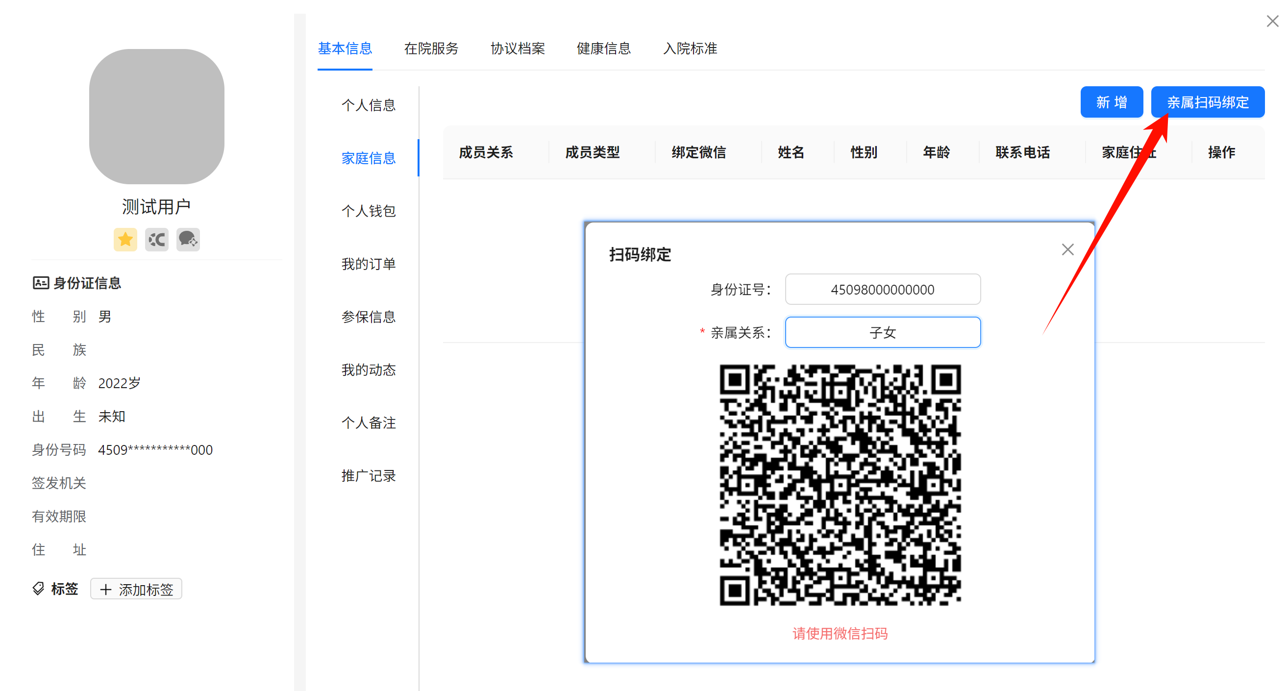 目录 搜索 *核心操作流程0.系统数据算法1.家属绑定流程2.信息录入1.营销管理1.1 接待管理1.2 全员档案1.2.1 个人档案信息2.在线商城3.在住退住1.长者入住办理2.床位分配3.个人档案4.费用管理1.预存管理-钱包充值 暂无相关搜索结果! 本文档使用 MinDoc 发布 1.家属绑定流程 家属绑定流程步骤一、家属注册1.家属注册可以通过刷度目机(直接用身份证刷机子)、实名认证、非实名认证注册 实名认证扫码(需身份证照片) 非实名认证扫码(需身份证号码) 步骤二、绑定家属确认注册成功后(可用身份证号到养老系统全员档案查询有无此人信息验证上),打开*养老系统-个人档案-家属信息 *进行家属绑定。 点击亲属扫码绑定-输入家属身份证号、亲属关系后,家属微信扫码绑定 文档更新时间: 2025-12-30 11:49 作者:易绍伟