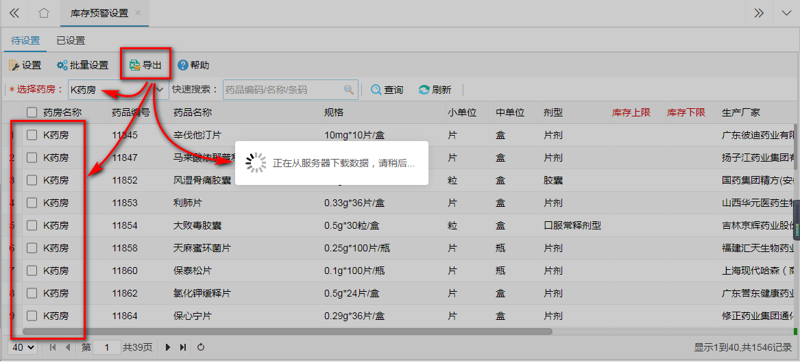 待设置 数据模块的导出功能导出的是用户 选择药房时所选药房的全部 未设置上下限 药品数据。