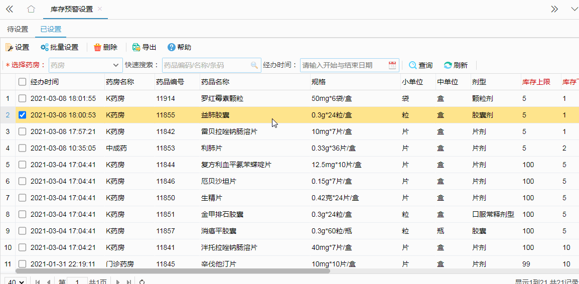 模块二这里多添加了一个删除的功能键,当用户在已设置数据模块中删除某一条药方药品数据时,该药房药品的库存上下限将会补清空,并且数据将回传到未设置页面。操作如下: