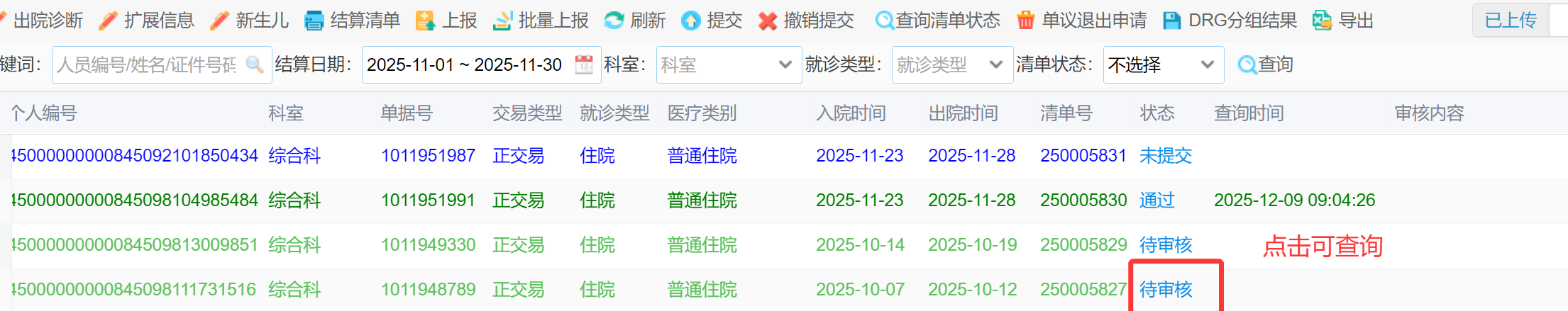 查询清单状态,手动查询,医保没有推送审核结果到HIS系统的功能。