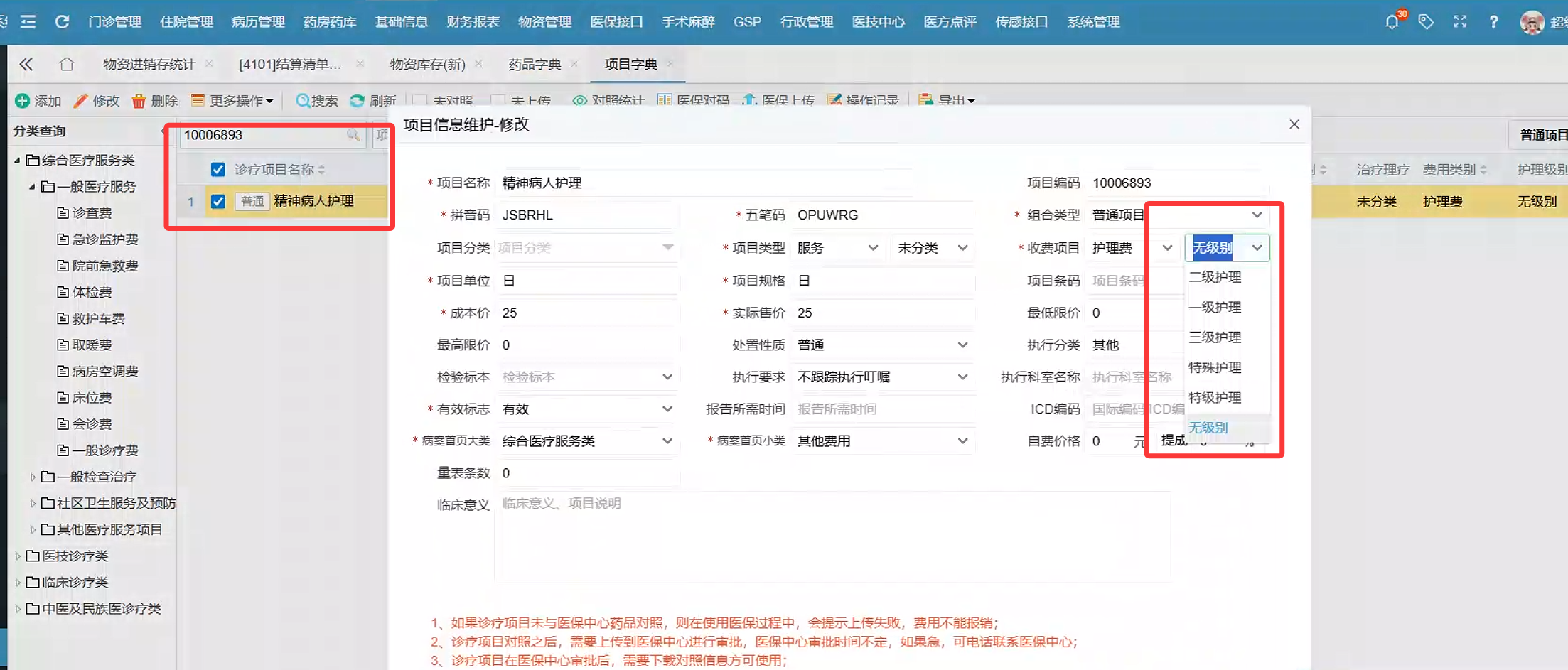 查询这个人的费用,有没有使用到护理费,如果有,则看下这个费用的护理级别是什么?