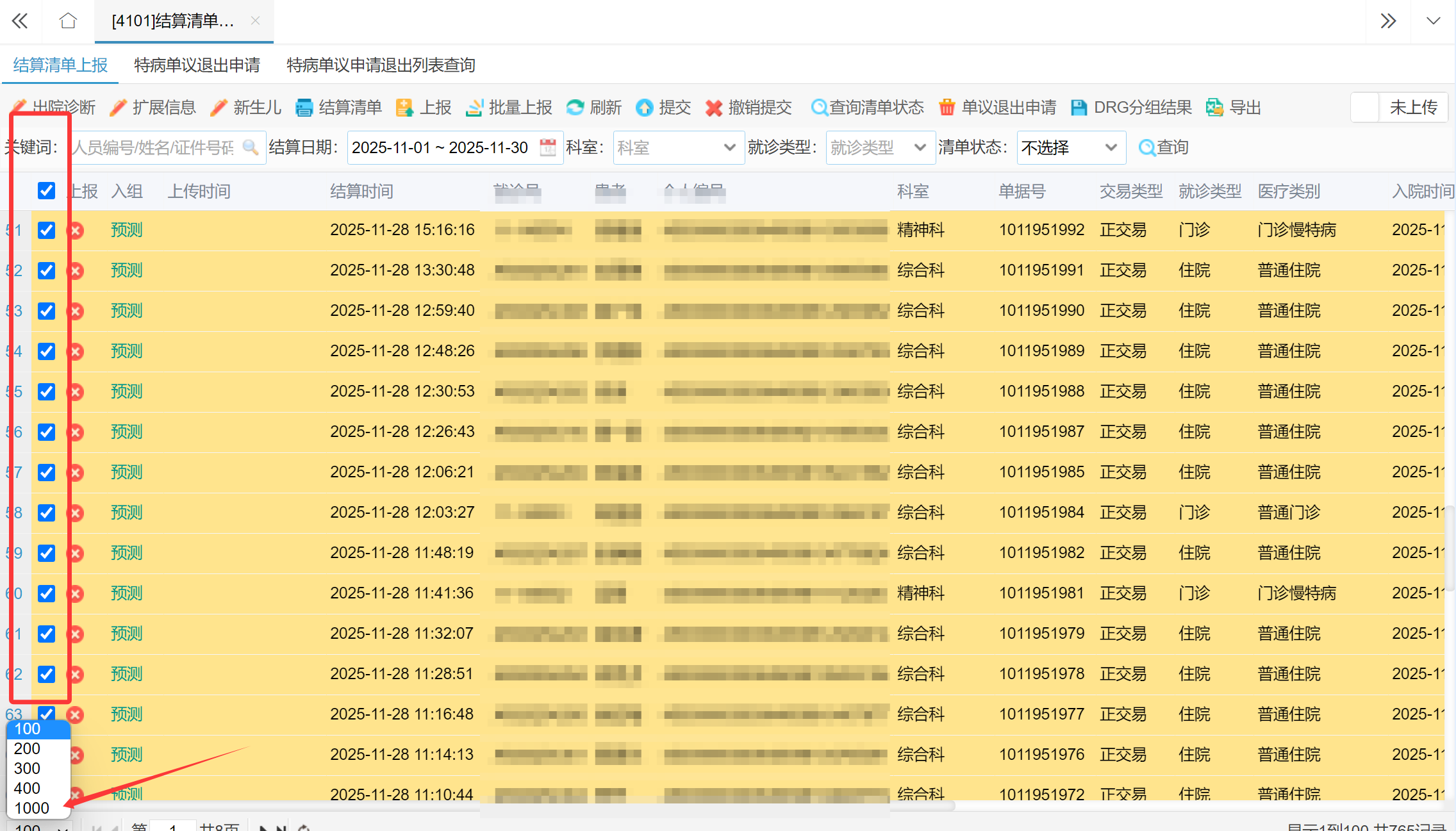 勾选需要上报的记录,如果数据量很多,可以设置当前页显示的数量,比如选择400,1000.