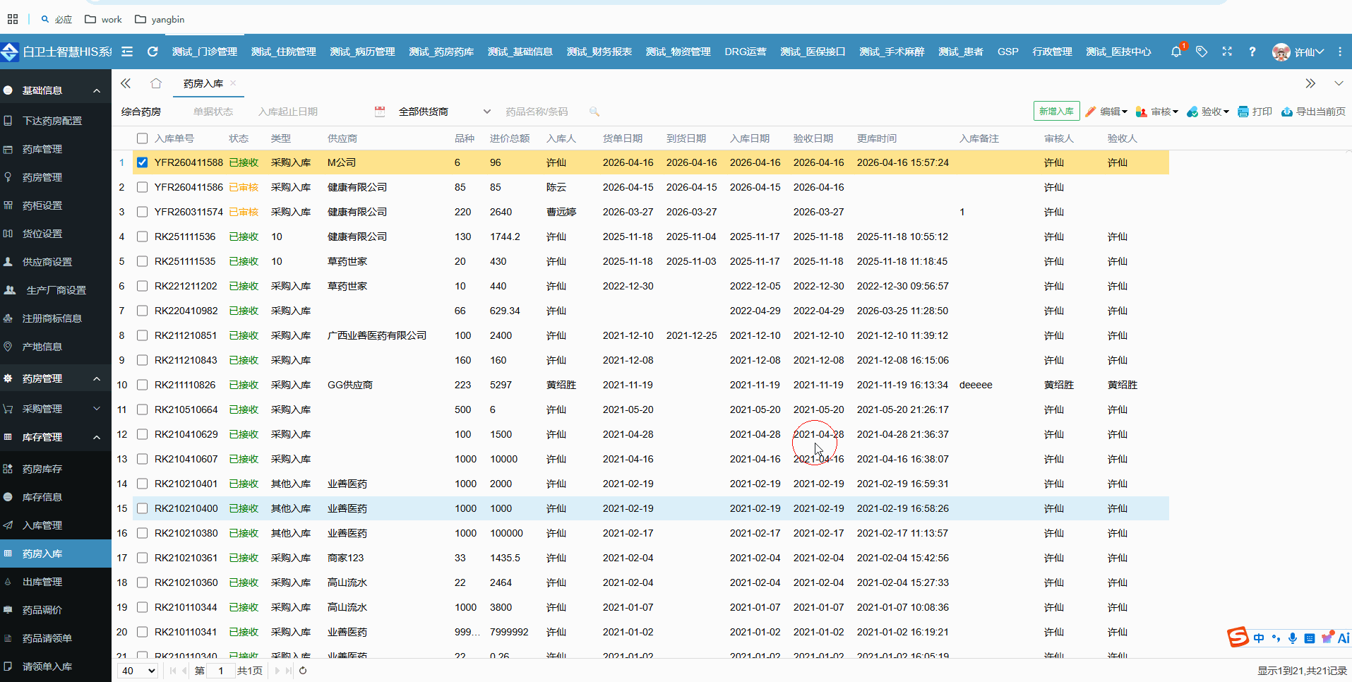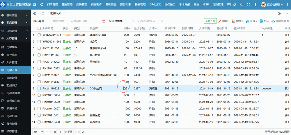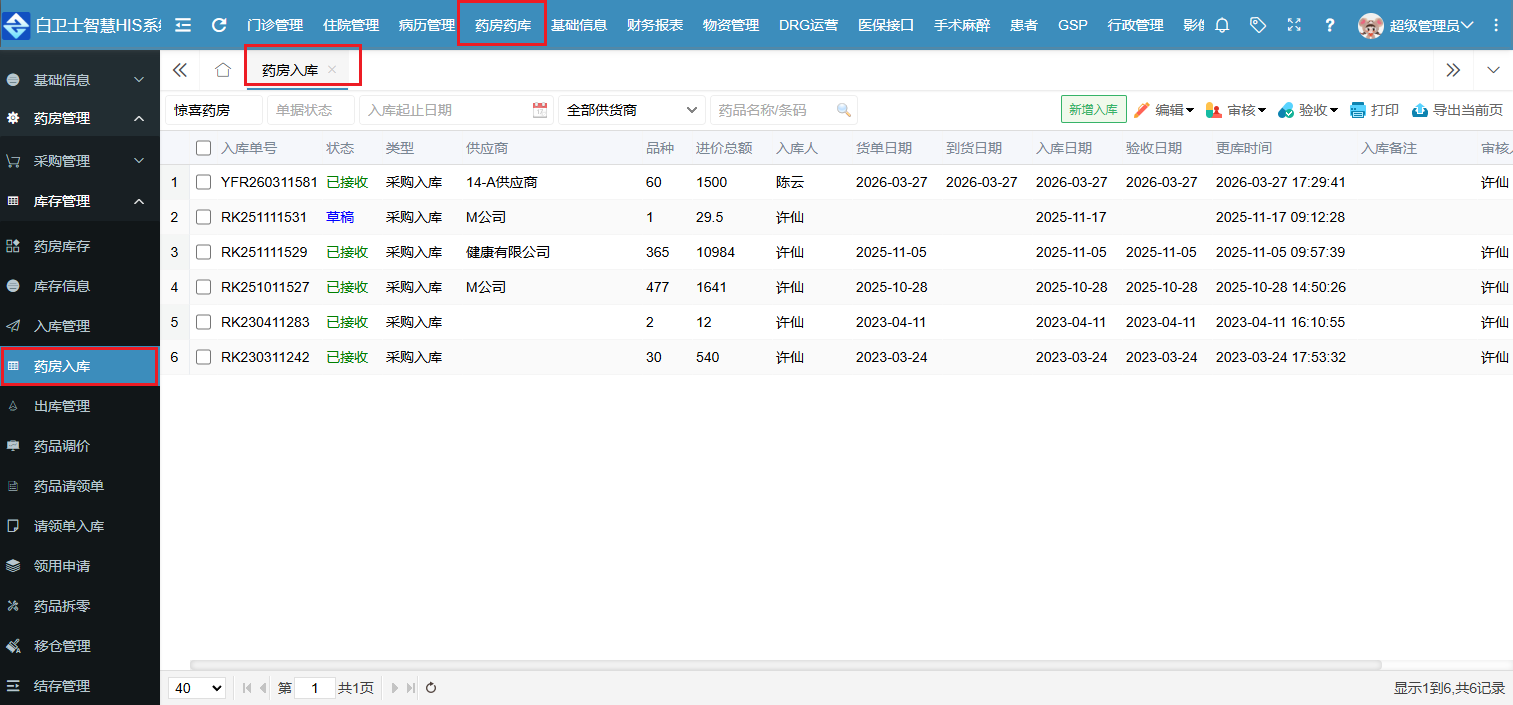 从药房入库的一个主页面来看,它与药房库存的大多数据项、信息和功能项是大体相似的,毕竟入库数据和库存的数据肯定是有联系的嘛!