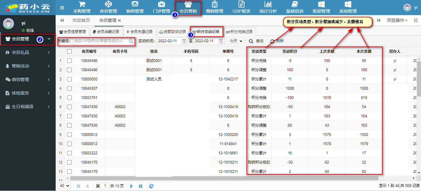 会员消费记录可以进行商品明细的查询、处方补录、麻黄碱补录、补打小票、撤消记录等。