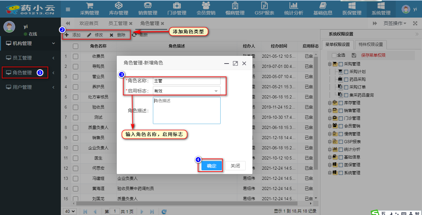 目录 搜索 更新日志1.采购管理1.1 采购计划1.2 药品采购1.3 采购订单1.4 集采药品查询2.库存管理2.1 验收入库2.2 库存查询2.3 退货出库2.4 盘点管理2.4.1 药品盘点2.4.2 损益单2.5 移仓管理2.6 养护管理3.销售管理3.1 药品销售3.2 销售记录3.3 结账交班3.4 提成设置4.门诊管理4.1 患者登记4.1.1 门诊挂号4.1.2 患者分诊4.1.3 排队叫号4.2 医生工作站4.3 诊疗管理4.3.1 检验室4.3.2 检查室4.3.3 治疗室4.4 收费管理4.5 药房发药4.6 患者维护4.6.1 患者档案4.6.2 随访管理4.7 查询统计4.7.1 接诊查询4.7.2 医生医务统计4.8 资料设置4.8.1 实验室检查设置4.8.2 实验室检查项目4.8.3 辅助检查设置4.8.4 治疗室设置4.8.5 诊查费设置4.8.6 其他费设置4.9 门诊设置4.9.1 门诊设置4.9.2 人体部位信息4.9.3 外送单位信息4.9.4 门诊功能设置4.10 模板设置4.10.1 病历模板4.10.2 西药处方模板4.10.3 中药处方模板4.10.4 治疗检查模板4.10.5 实验室检查模板4.10.6 辅助检查模板4.10.7 材料费模板4.10.8 其他收费模板4.11 中医开方信息4.12 疾病字典4.12.1 西药疾病4.12.2 中医辩证5.会员营销5.1 会员管理5.2 会员礼品5.3 营销活动5.4 微信管理5.5 体检报告5.6 生日祝福语6.慢病管理6.1 健康档案6.2 服务签约6.3 健康评估6.4 健康指导6.5 健康干预7.GSP报表7.1 设施设备7.1.1 设施设备管理7.1.2 随诊包管理8.统计分析8.1 运营统计8.2 药品统计8.3 医务统计8.4 费用统计8.5 提成统计8.6 预警分析8.7 医疗室统计9.基础信息9.1 药品字典9.2 字典参数9.3 货位管理9.4 供应商管理9.5 健康小贴士9.6 常用地址设置10.医保管理10.1 定点药品销售10.2 门诊收费管理10.3 医保数据下载10.3.1 西药中成药目录10.3.2 中药饮片目录10.3.3 医疗机构制剂目录10.3.4 民族药品目录10.3.5 医疗服务项目目录10.3.6 医用耗材目录10.3.7 疾病与诊断目录10.3.8 手术操作目录10.3.9 门诊慢特病种目录10.3.10 按病种付费病种目录10.3.11 日间手术治疗病种目录10.3.12 医保目录信息查询10.3.13 肿瘤形态学目录10.3.14 中医疾病目录10.3.15 中医证候目录10.3.16 医疗目录和医保目录匹配信息查询10.3.17 医药机构目录匹配信息查询10.3.18 医保目录限价信息查询10.3.19 医保目录先自付比例信息查询10.3.20 广西单病种查询10.3.21 门慢病种限定目录信息查询10.3.22 医疗机构目录匹配审核查询10.3.23 门慢病种开展信息查询10.4 医保结算信息10.5 医保信息查询10.6 个帐共济10.7 医保人员备案10.8 进销存管理10.9 信息采集上传10.10 项目目录对码11.系统管理11.1 机构管理11.2 员工管理11.3 角色管理11.4 用户管理常见问题客户端安装 暂无相关搜索结果! 本文档使用 MinDoc 发布 11.3 角色管理 角色管理是指管理系统中不同的人所扮演的不同角色;员工管理添加完毕后,进行员工的角色分配权限,每个角色每个岗位的权限都不太一样。 文档更新时间: 2022-01-18 10:44 作者:易彪